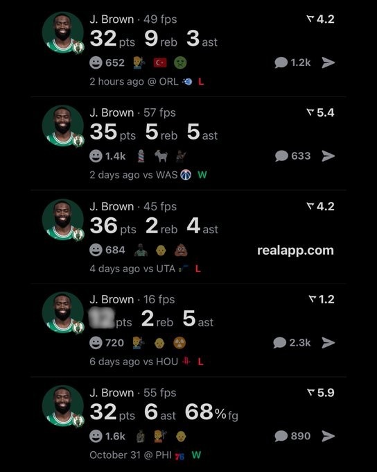 过去5场比赛,布朗四次砍下30+,赛季至今,他场均砍下28.1分。